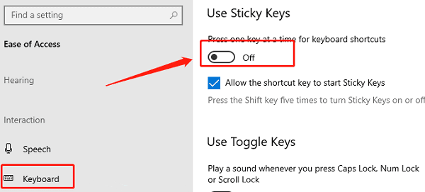 In the keyboard settings page, locate the switch for "Use Filter Keys" and ensure it is turned off.