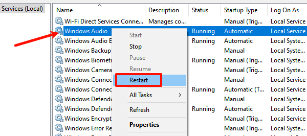 2. In the service list, find the "Windows Audio" service and check its status.